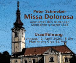 2026 feiert die Pfarre Graz-St. Veit ihr 800-jähriges Bestehen. Der Dirigent und Komponist Peter Schmelzer nimmt dies zum Anlass für die Uraufführung seiner Missa dolorosa – gewidmet den leidenden Menschen unserer Erde. Die Komposition ist für das zeitgenössische Kirchenmusik-Repertoire geschaffen und funktioniert sowohl als Konzertaufführung als auch für den liturgischen Gebrauch und als szenisches Oratorium. [10.04.2026]
